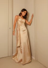 Saia com Detalhes: A saia do vestido é trabalhada com detalhes que adicionam textura e movimento à peça. através de camadas suaves, esses detalhes conferem à saia uma fluidez encantadora, tornando-a perfeita para dançar e se mover com graça durante o evento.