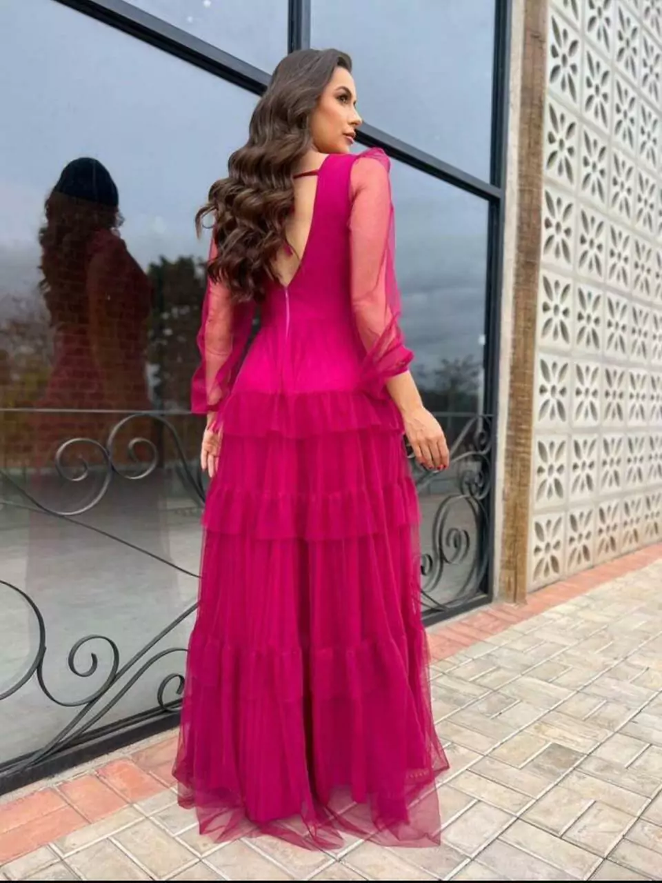 Confeccionado em Tule Cristal: Feito com tule cristal de alta qualidade, este vestido oferece um visual leve e etéreo que é simplesmente cativante.