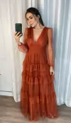 • Detalhes de "3 Marias" Babados na Saia: O destaque deste vestido está na saia com detalhes de "3 marias" babados. Essa característica adiciona uma dose extra de drama e movimento ao vestido, criando uma estética romântica e elegante que é lisonjeira para todos os tipos de corpo.