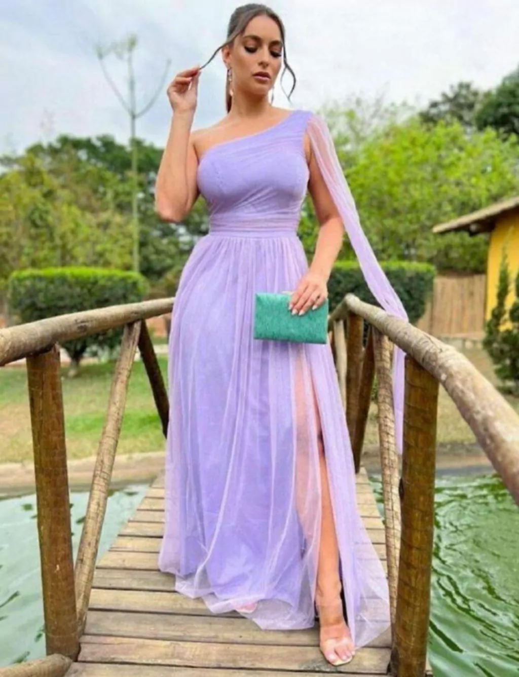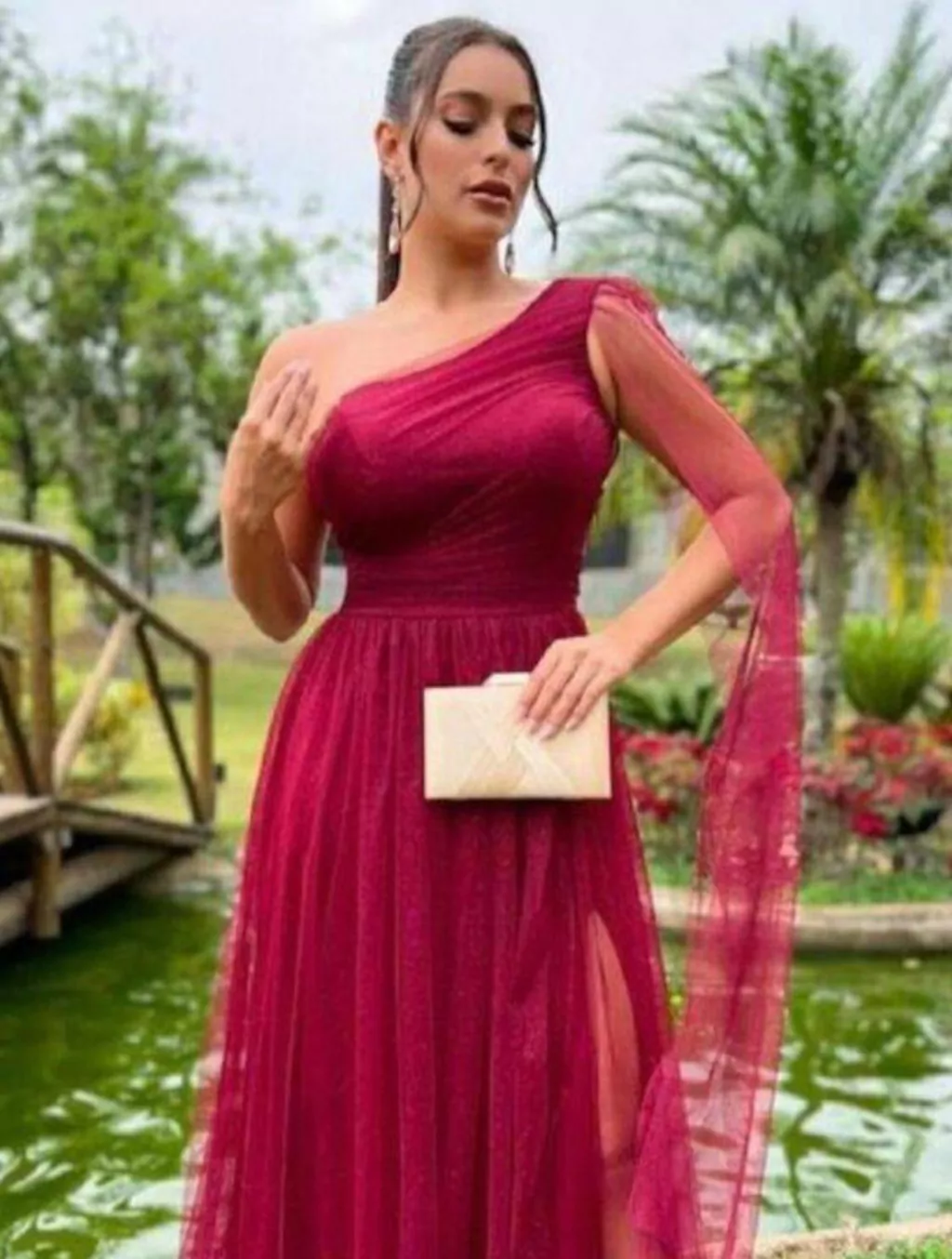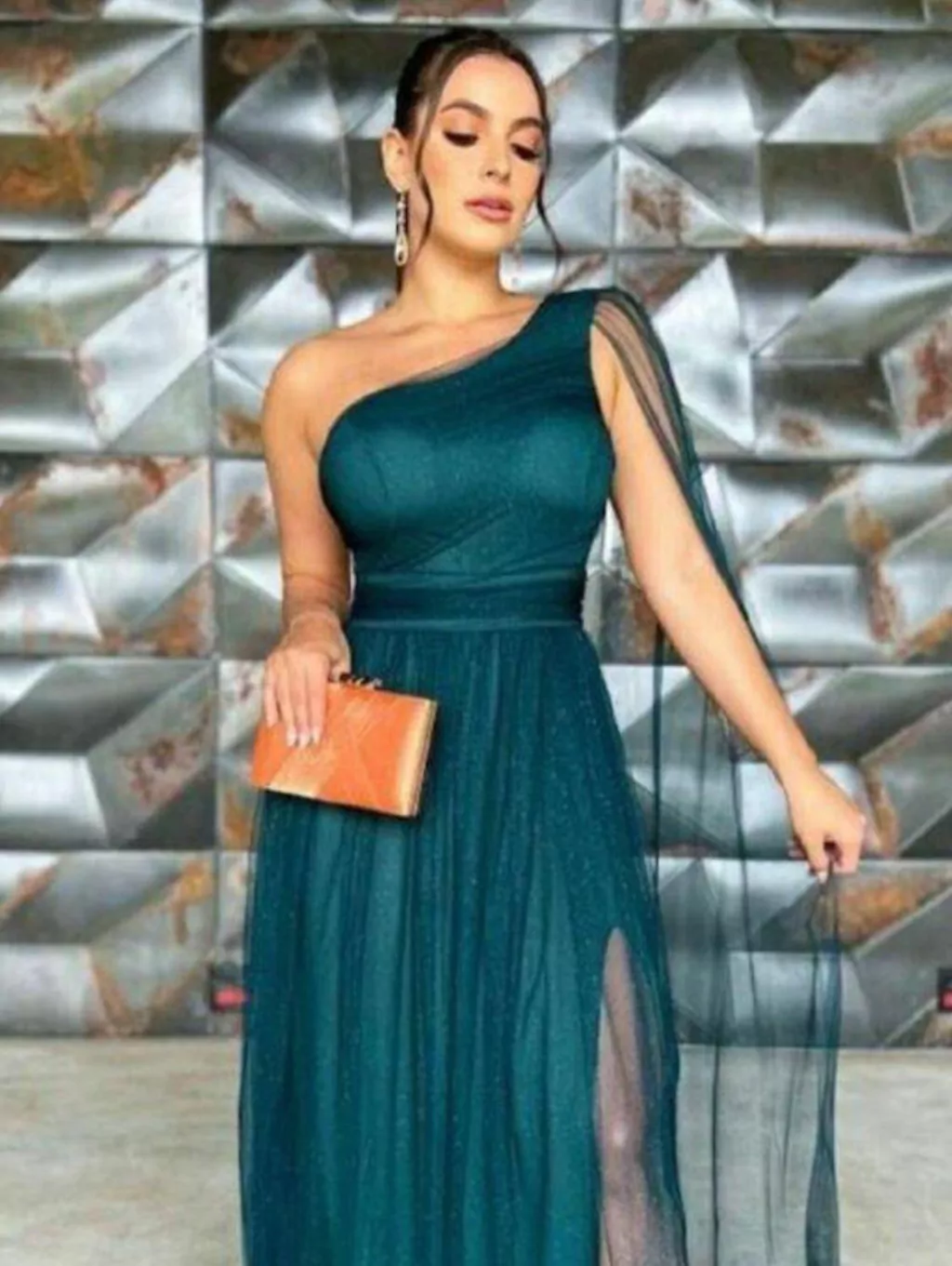 Design de Um Ombro Só: Com um design de um ombro só, este vestido adiciona um toque de glamour e modernidade ao visual. A assimetria do ombro único cria uma silhueta única e estilosa, enquanto realça elegantemente os ombros.