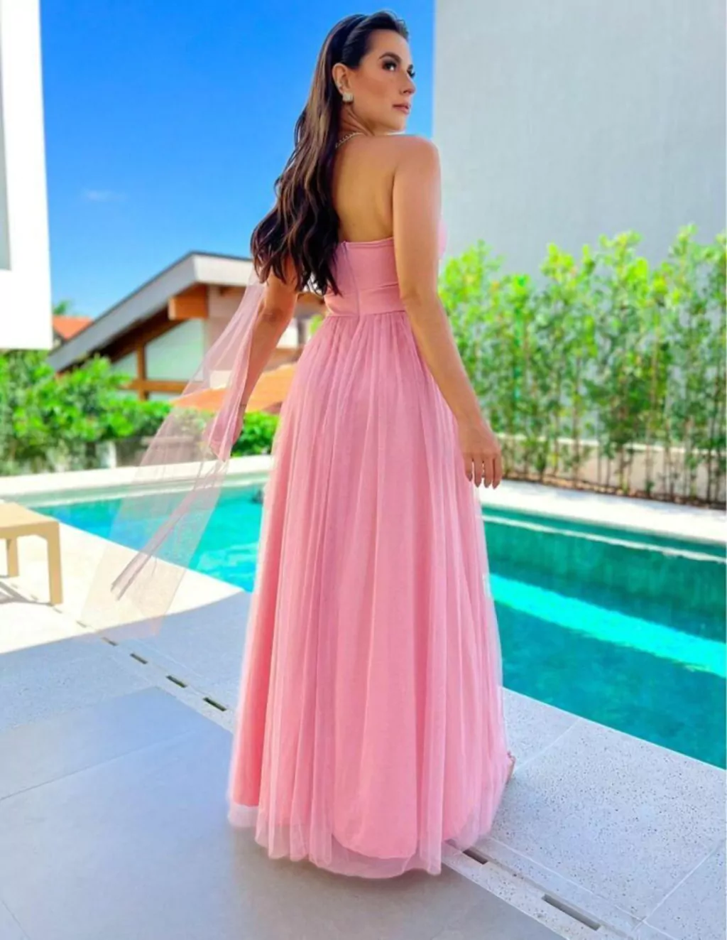 Tule Cristal com Brilho Sutil: O tecido usado neste vestido é o tule cristal com brilho sutil, que acrescenta um toque de luxo e sofisticação ao visual. O brilho delicado do tule cristal captura a luz de maneira deslumbrante, garantindo que você brilhe com elegância em qualquer evento.