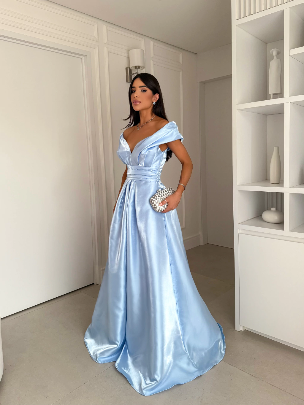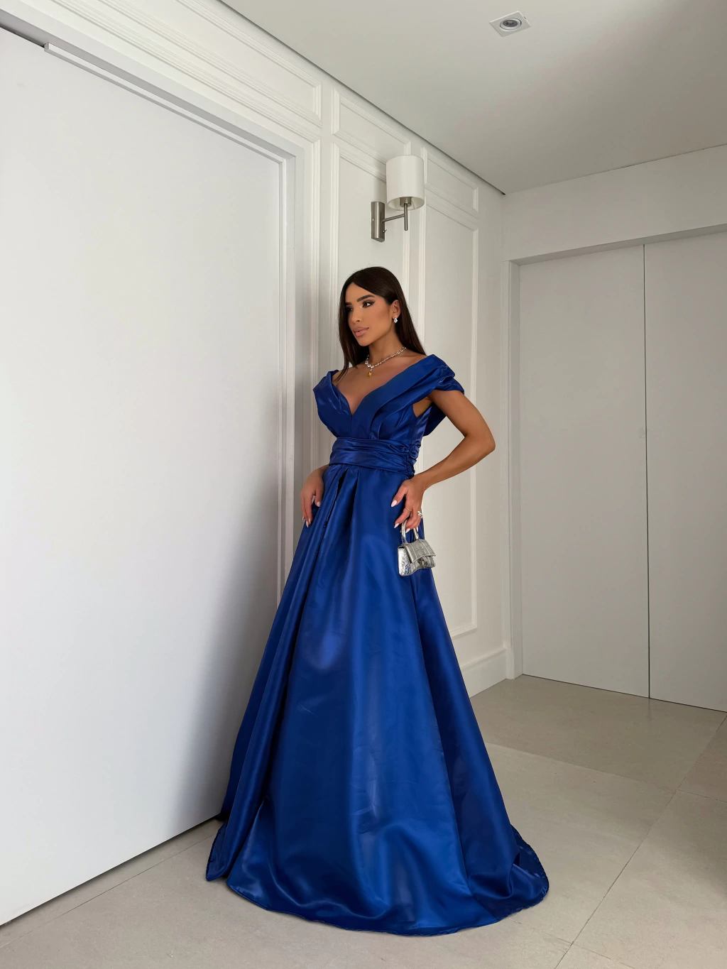 Seu decote profundo em "V" e as alças largas que se cruzam suavemente nos ombros criam uma estrutura clássica e imponente, valorizando o colo com charme e estilo. A cintura marcada por drapeados realça a silhueta feminina, enquanto a saia ampla em formato A proporciona um caimento majestoso e fluido.