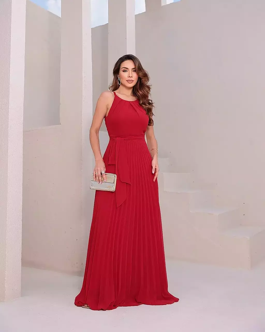 Seu design longo valoriza a elegância e o porte da mulher, tornando-o ideal para casamentos, formaturas e eventos de gala. A combinação do tecido fluido com a saia plissada cria um visual sofisticado e atemporal.